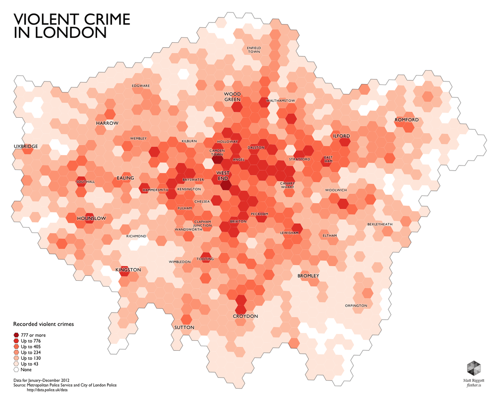 My experiments with hexagon binning and simulated annealing. Data from January to December 2012 provided by the Metropolitan Police Service and the City of London Police.