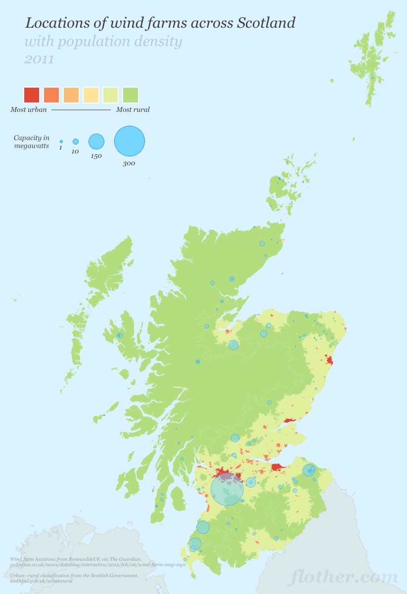 Locations of wind farms across Scotland, overlaid on top of the Scottish Government’s urban–rural classification.